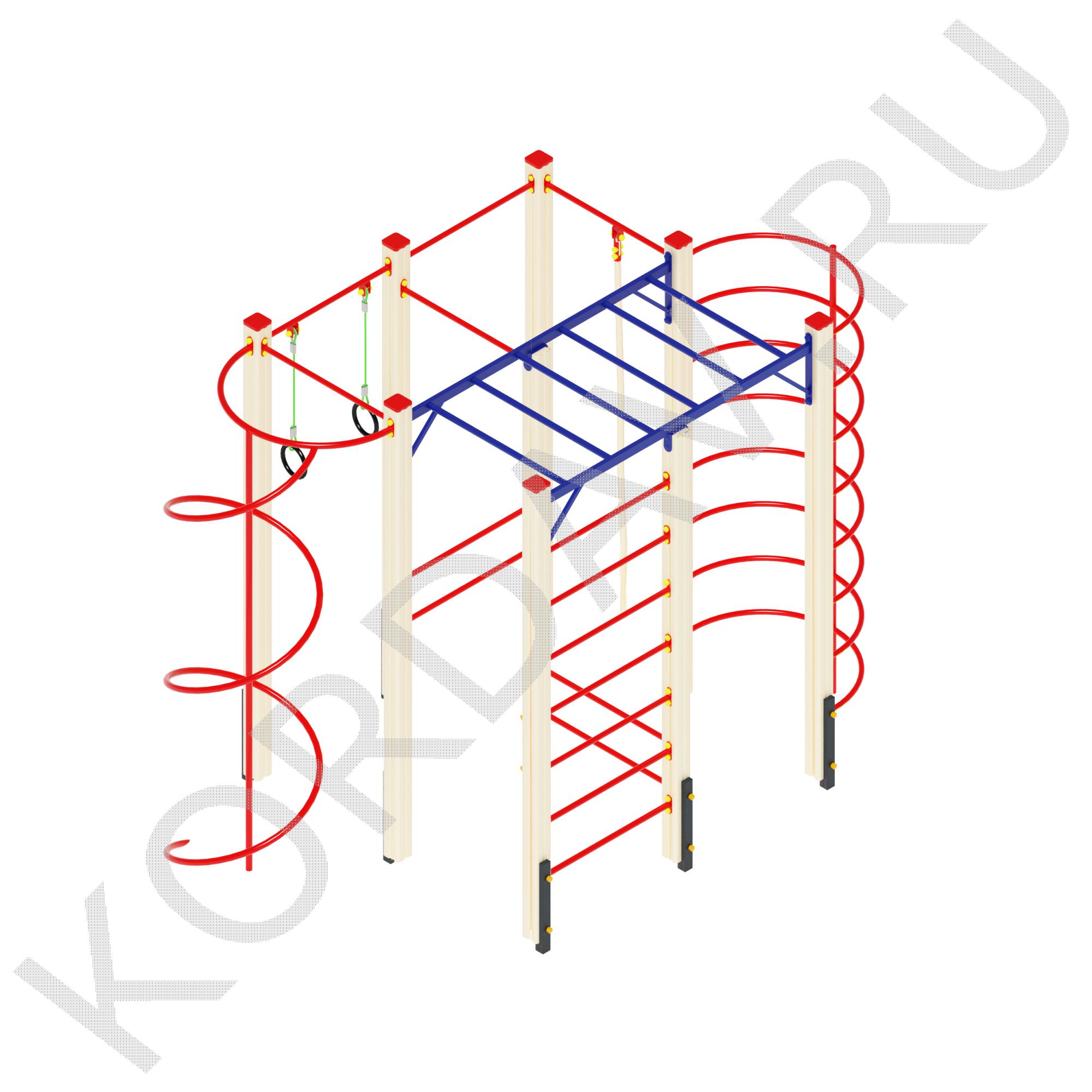 Спортивный комплекс представляет собой кольца, рукоход, несколько лестниц, канат, стенку для лазинья, турник и канат, объединенные в цельную конструкцию. Он устанавливается на уличных детских площадках, спортивных и игровых. Каждый элемент конструкции отличается от другого цветом – такой яркий дизайн способен заинтересовать любого ребенка. Здесь детей в игровой форме можно обучать основным физическим упражнениям, развивая все группы мышц.